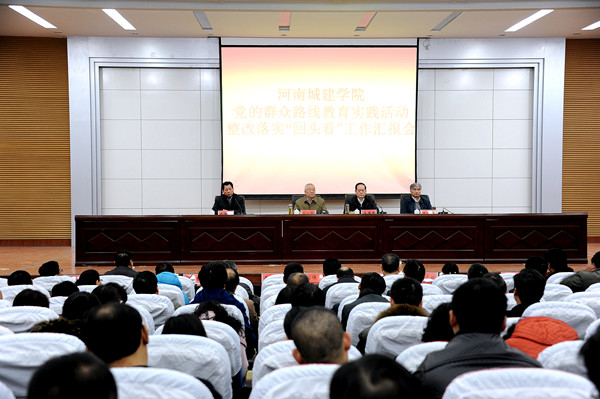 李功勋传达了中央和省委关于开展“回头看”工作的有关精神,简要介绍了全省第二批党的群众路线教育实践活动单位综合评估情况。他说,河南城建学院自群众路线教育实践活动开展以来,党委行政领导班子成员高度重视,校内各级领导高度负责,积极发挥带头作用,以上率下,活动领导小组和办公室成员认真组织、扎实推进,全体党员和广大教职工积极参与和支持,取得了显著成效。学校在教育实践活动综合评估中获得了最高等次“好”。他希望学校保持作风建设好的势头,坚持不懈抓作风建设,着眼于长效机制,把活动中零星的经验和做法系统化,通过深入抓、反复抓、长期抓使作风建设成为广大党员和党员领导干部的行动自觉;用制度固化活动成果,确保制度执行到位,使遵守制度成为党员和党员领导干部的行为习惯;不断联系群众,通过各种形式了解师生情况、倾听师生意见,把师生的美好愿望当作工作追求,把学校各项工作做得越来越好。