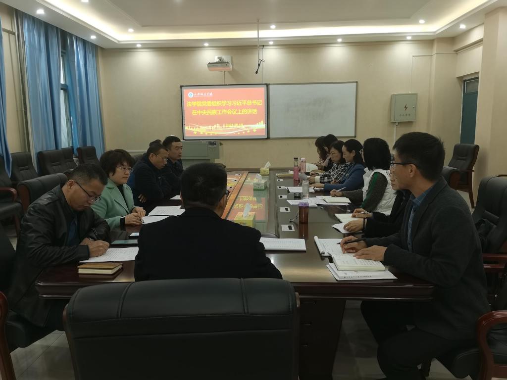 (通讯员 汤继华)10月19日下午,法学院党委在院会议室召开专题会议,学习习近平总书记在中央民族会议上的重要讲话精神,会议由法学院副院长、统战委员张强主持,全体教职工参加会议。